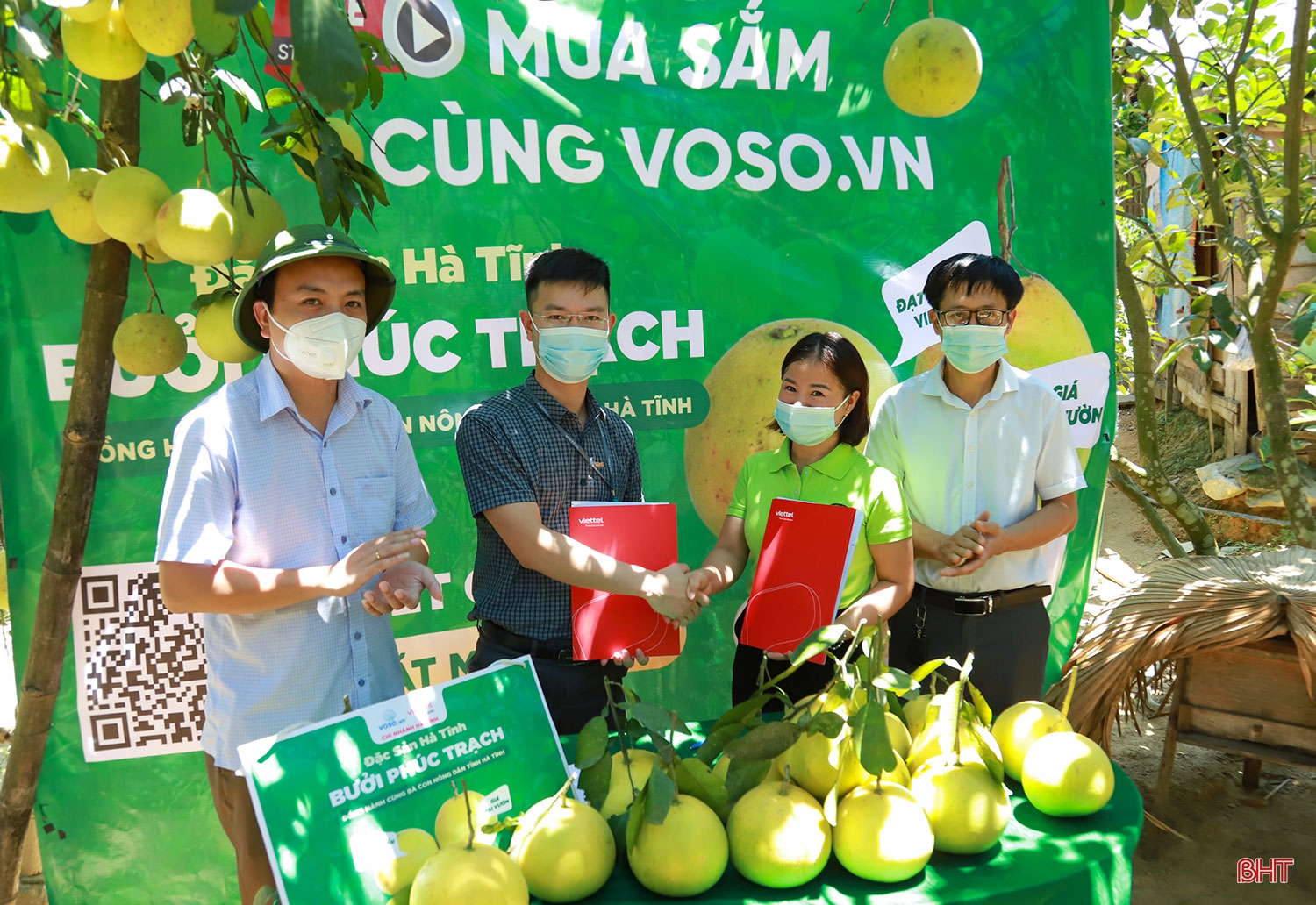 Đại diện sàn thương mại điện tử Voso.vn (thuộc Công ty CP Bưu chính Viettel) tại Hà Tĩnh ký kết hợp đồng liên kết tiêu thụ sản phẩm bưởi Phúc Trạch với các hợp tác xã trên địa bàn huyện Hương Khê.